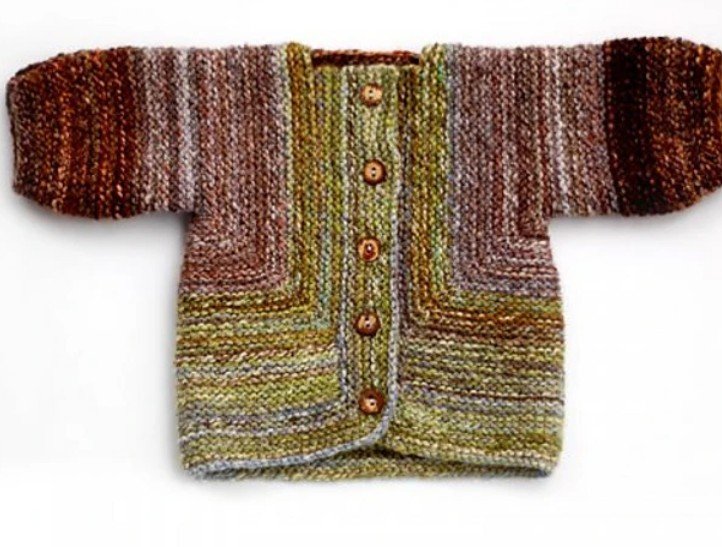 We will make a baby sweater to finish quickly so you can see how the knitting goes together in this unusual construction. The pattern includes sizes from baby to adult, and even gives instructions based on your choice of yarn weight. You will be able to use this pattern over and over as the child grows. The sweater is very easy to customize to add a collar, hood, button band, or even an I cord bind off for trim.