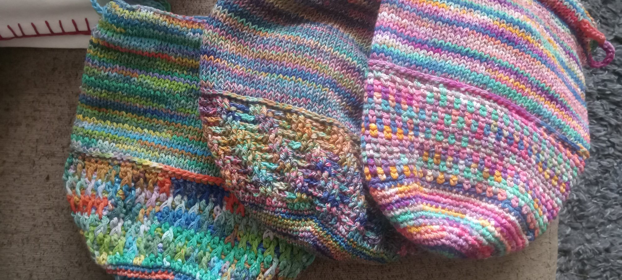 A small project bag or purse designed by Jamie B. Combines crochet and knitting to create a self-lined, reversible bag, perfect for self-striping yarn and color work doodles!
